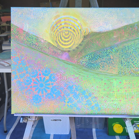 Bring home a fresh twist on a classic view. Sunburst Serenity is a vibrant acrylic and spray paint landscape that reimagines the timeless beauty of mountain scenery. A bold, radiant sun takes center stage, casting light across sweeping peaks, a wildflower-dotted foreground, and an open, colorful sky.